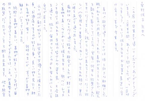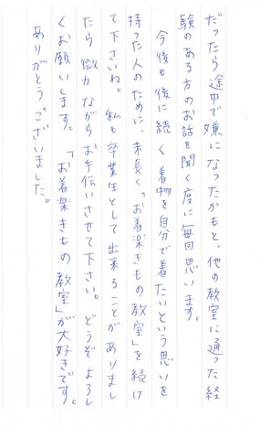 今後も後に続く着物を自分で着たいという思いを持った人のために、末永く「お着楽きもの教室」を続けて下さいね。私も卒業生として出来ることがありましたら微力ながらお手伝いさせて下さい。どうぞよろしくお願いします。「お着楽きもの教室」が大好きです。