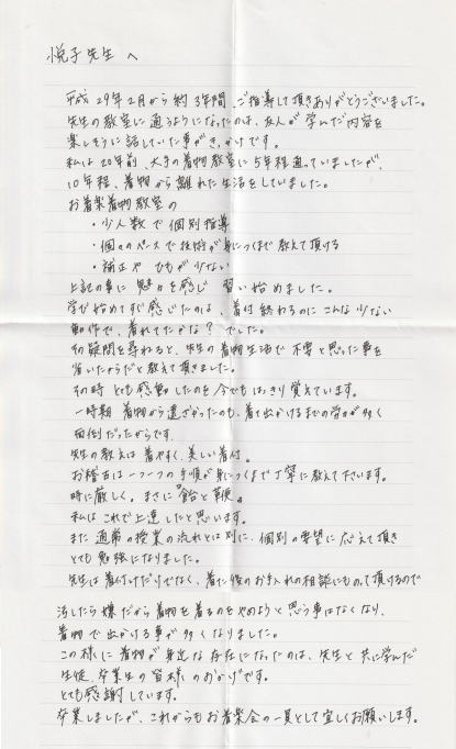 先生はお稽古を通じて、生徒自身の気づきを大切にして下さるように感じました。技術については「3歩進んで2歩さがる♪〜」を繰返す私の、「コノ部分がまた上手くいかな〜い(T_T)」という“泣き言”を受け止めて下さり、そのおかげで、ゆっくり、根気よ〜くこれからも習得していければな〜と思えるようになりました。また定期的にイベントを開催して下さるので、そこでは雑誌等メディアでみるモデルさんたちの着姿とは違った、同窓生のリアルな着姿を“生でわかちあえる場”も得られました。